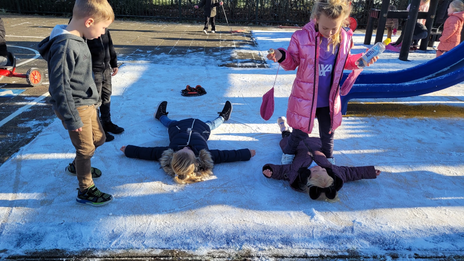 Wat hebben wij vandaag ons heerlijk buiten vermaakt: sleetje rijden, sneeuwengelen maken, skiën en sneeuwballen gooien. Gezellig!