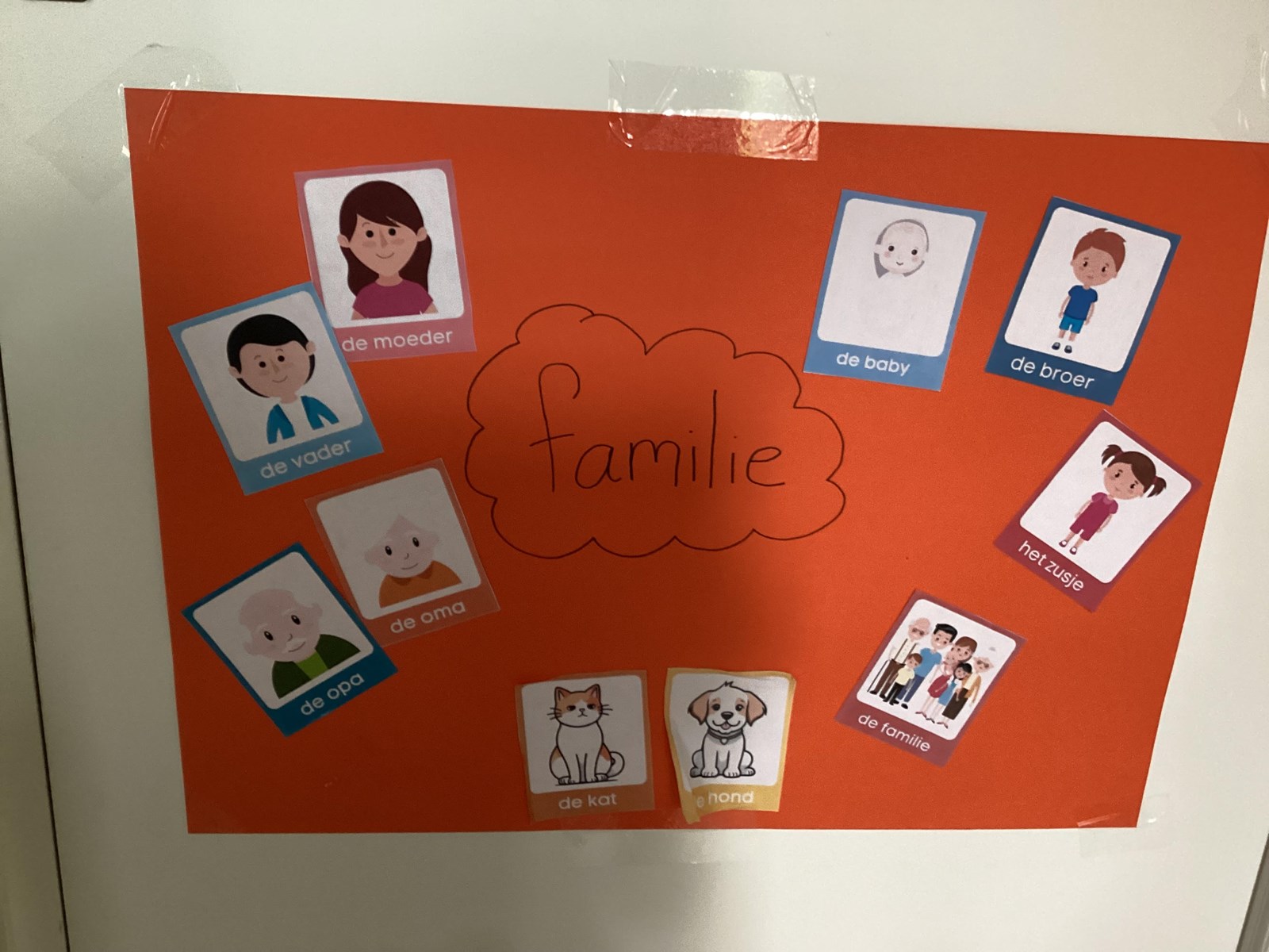 Op het raam hebben wij een grote boom geschilderd en daar hangen foto’s van de kinderen met hun familie in, dit is onze familieboom. Ook leren de kinderen wie er allemaal in hun familie zitten. Papa, mama, broertje, zusje, kat of hond.