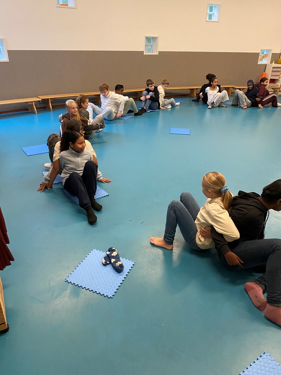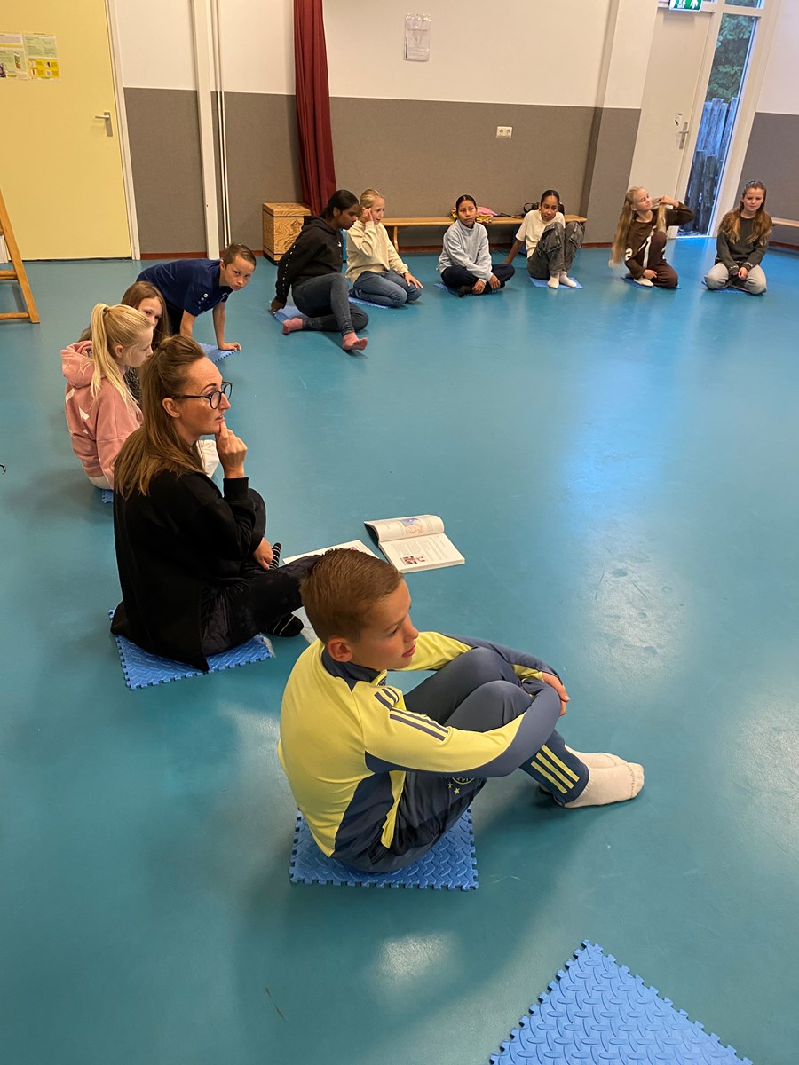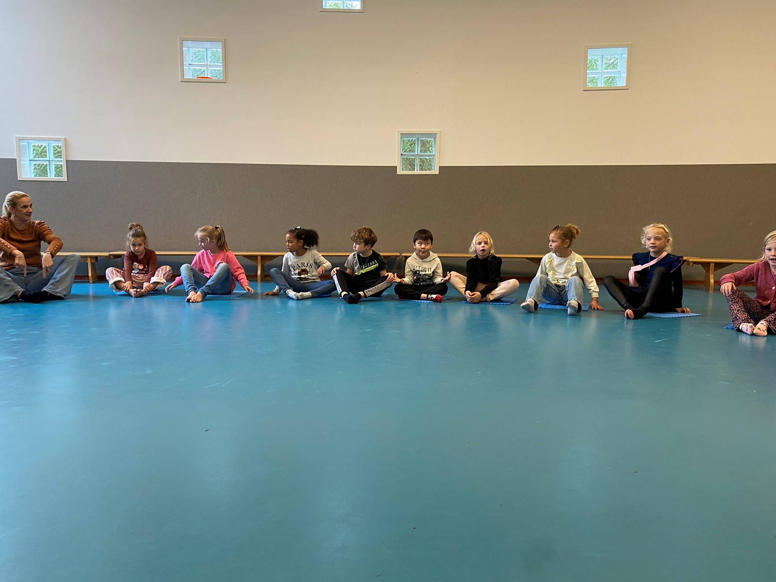 Vandaag kregen de groepen 3 t/m 8 een yogales in de speelzaal.