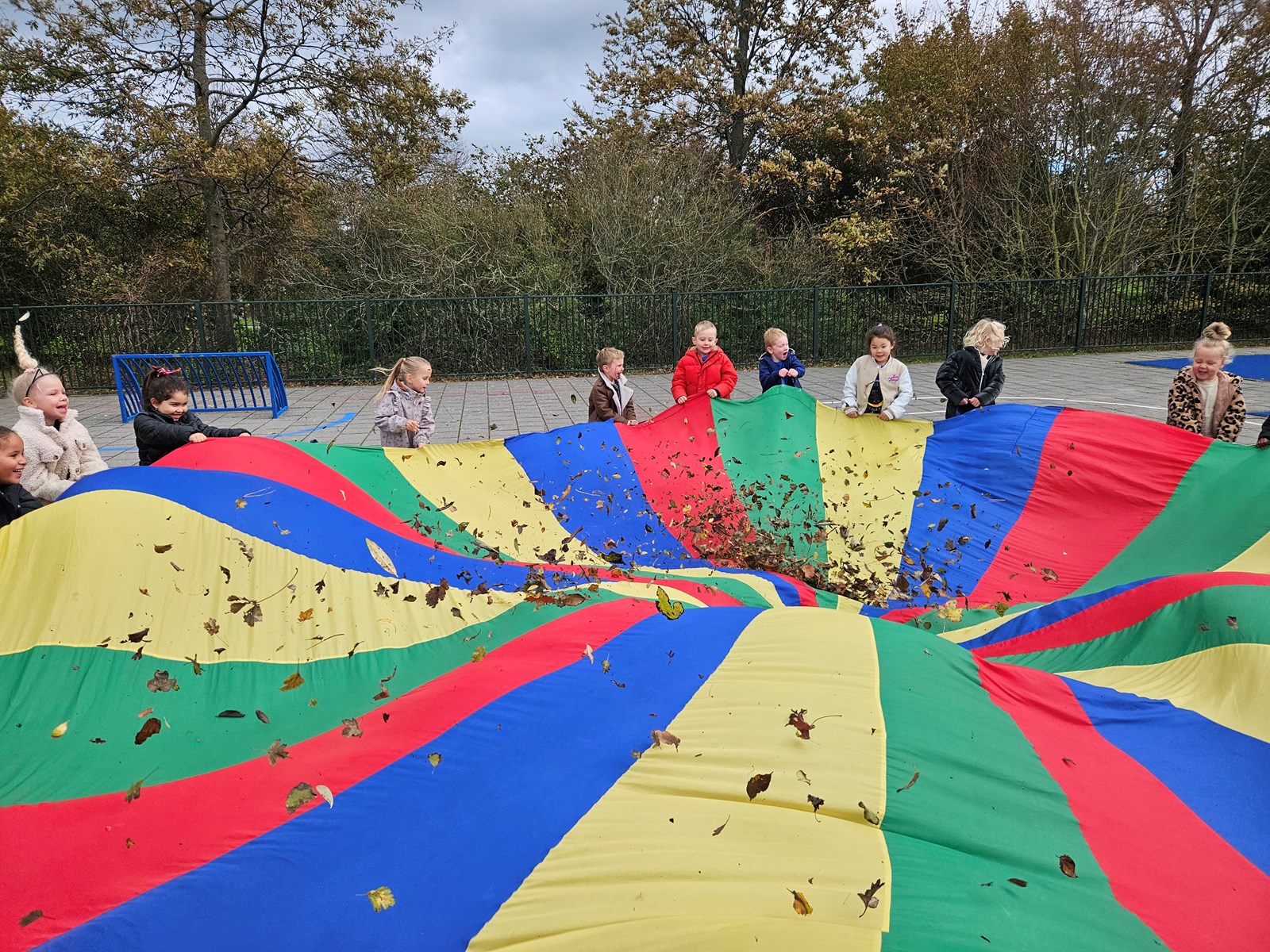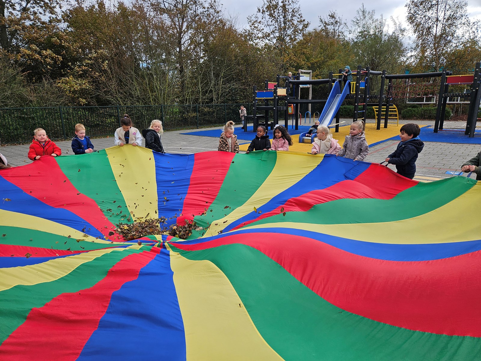 We hebben allerlei leuke dansen en spelletjes gedaan en zelfs nog de hele parachute vol met herfstblaadjes gestrooid wat tot veel hilariteit leidde! De kinderen lieten zien hoe ze door goed samen te werken de blaadjes (én knuffel) hoog in de lucht konden krijgen. Kanjers!