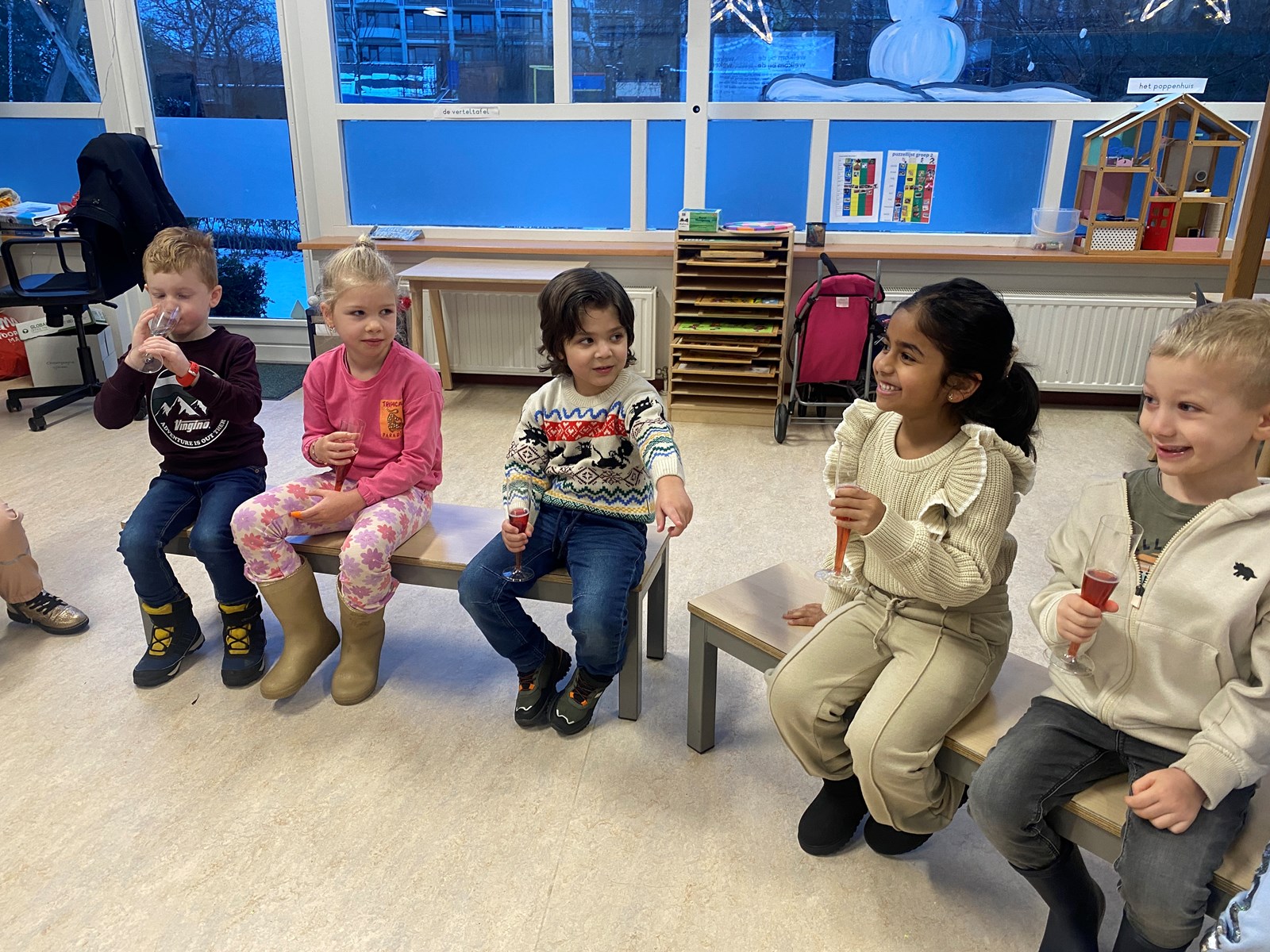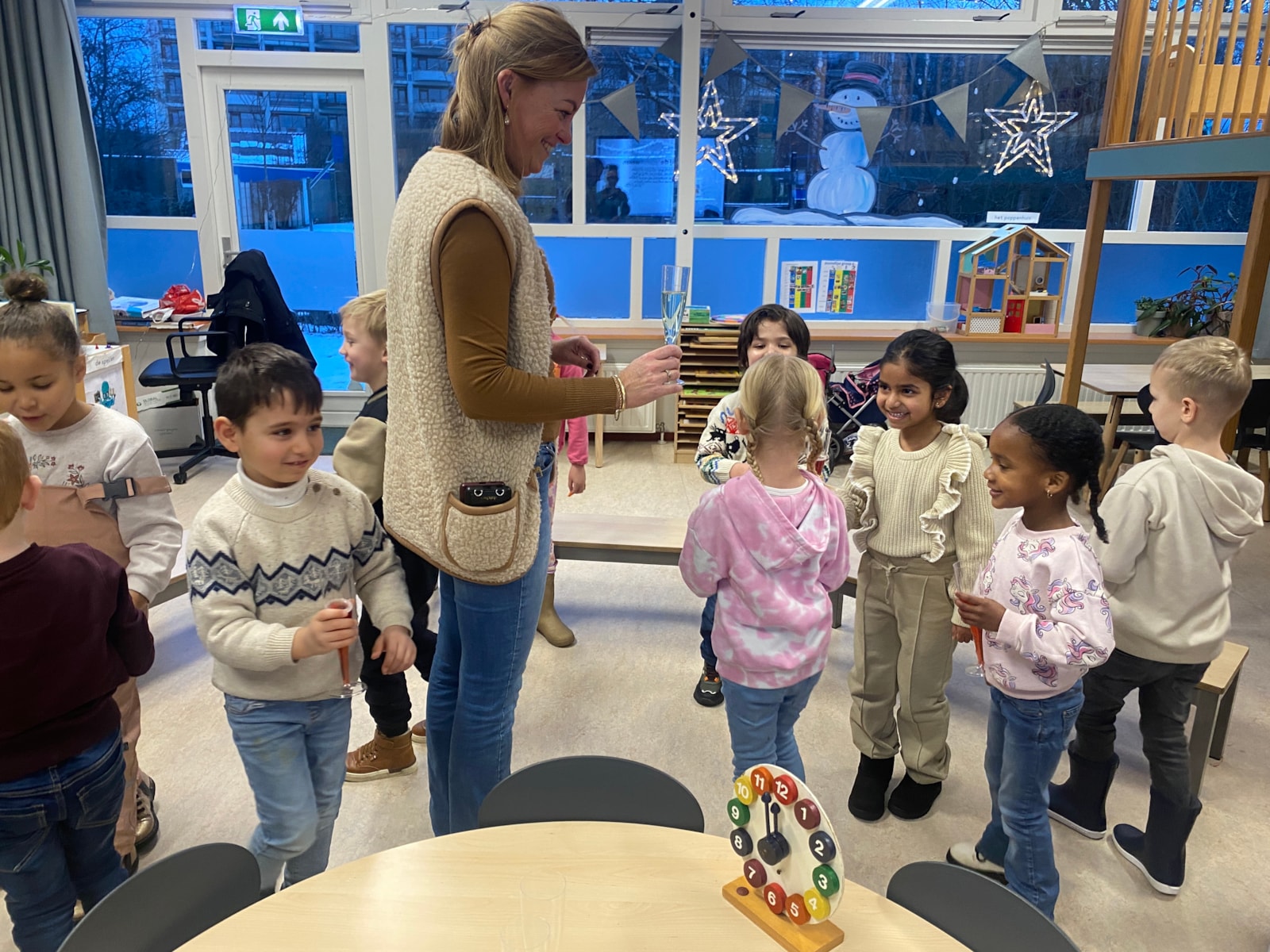 We zijn de dag vandaag feestelijk begonnen door te proosten op het nieuwe jaar en elkaar een gelukkig nieuwjaar te wensen.Daarna konden we natuurlijk niet anders dan naar buiten gaan en lekker spelen in de sneeuw. We hebben de sneeuw geschilderd, sneeuwballen gemaakt en een sneeuwpopje. Het sneeuwpopje was zo goed gelukt dat we deze natuurlijk mee naar de klas wilde nemen. Helaas ontdekte we dat sneeuwpoppen niet zo van warmte houden, zelfs het openzetten van het raam mocht niet baten.