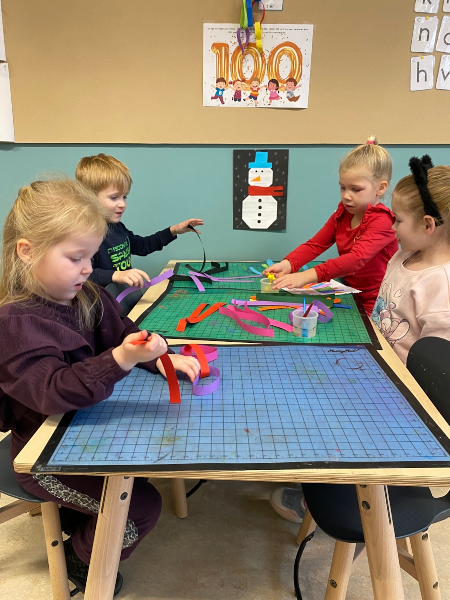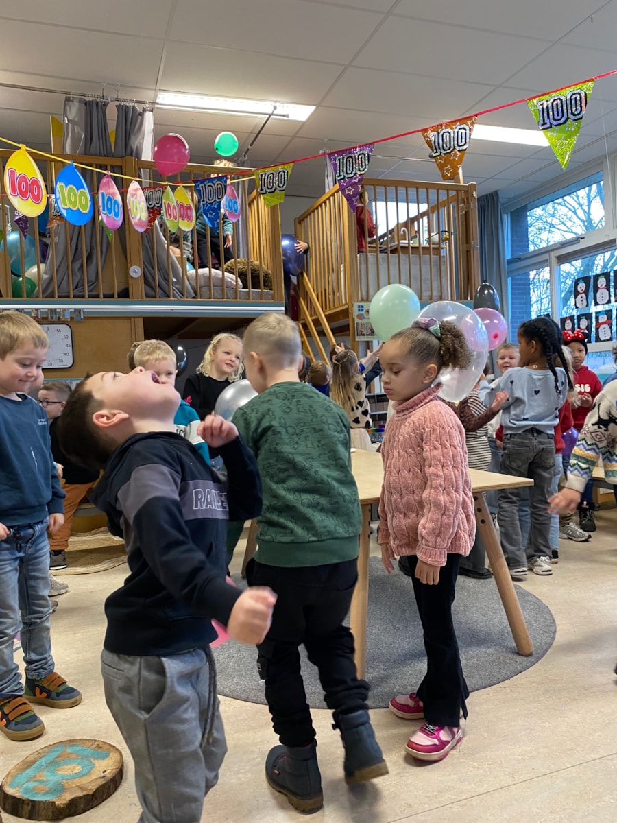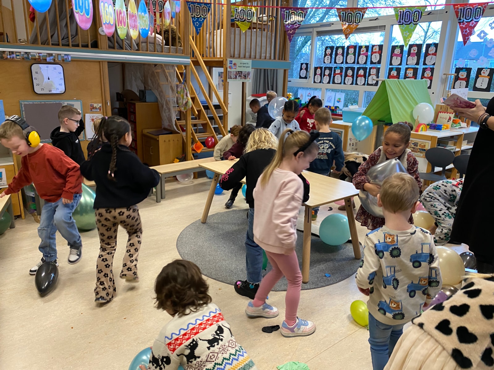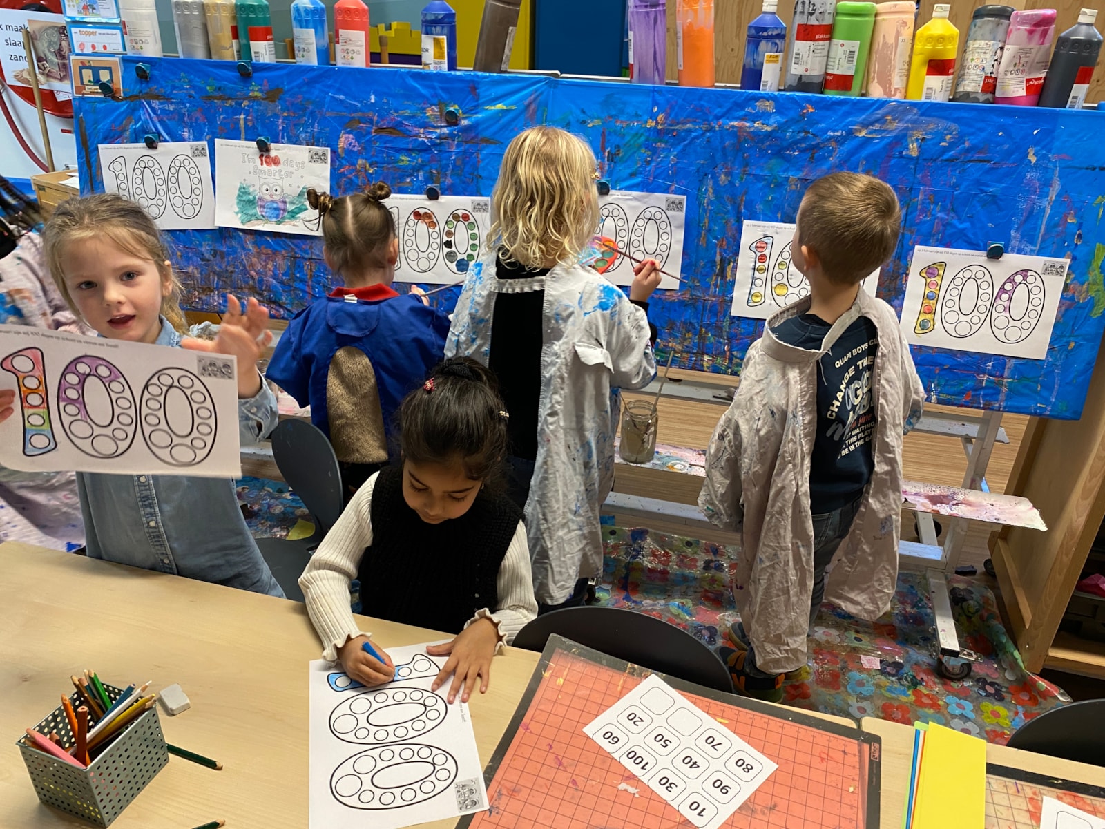 We waren vandaag al 100 dagen op school en dat hebben we flink gevierd met een ’100-dagen-feest’. We hebben 100 kaarsjes uitgeblazen, lekkere cakejes (versierd met een ’100’) gegeten, gebouwd en gespeeld met dingen waar we er 100 van hadden geteld, gegymd waarbij we bewegingen 100 seconden moesten volhouden, 100 ballonnen laten knallen, een slinger van 100 ringen gemaakt, gemeten met een meetlint van 100 centimeter. We hebben zelfs geschat waar we in 100 stappen naar toe zouden kunnen lopen en dit bleek bijna heel rondje door de school te zijn.