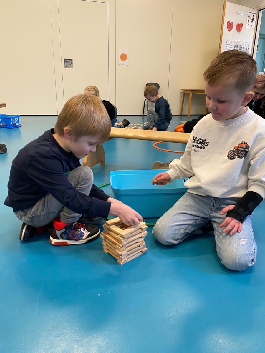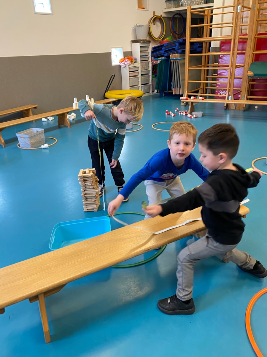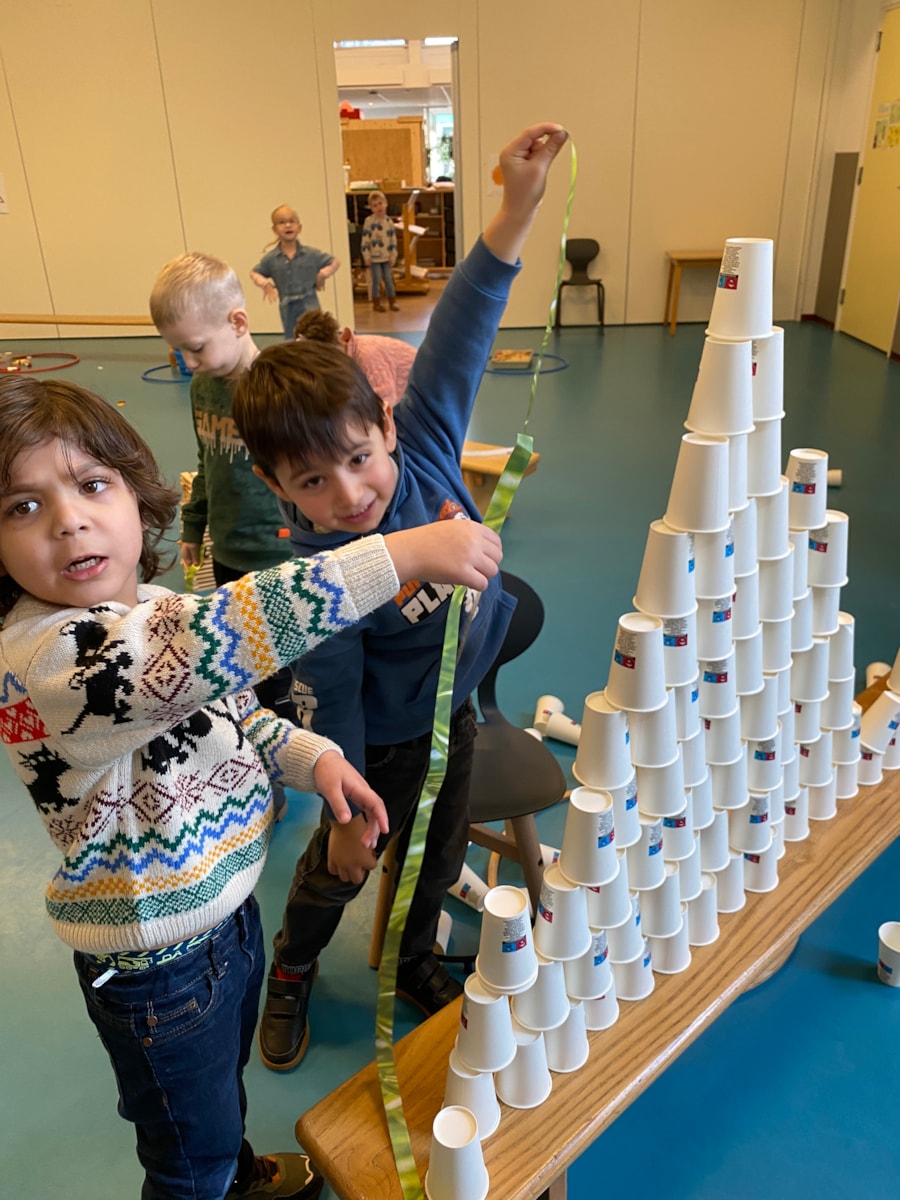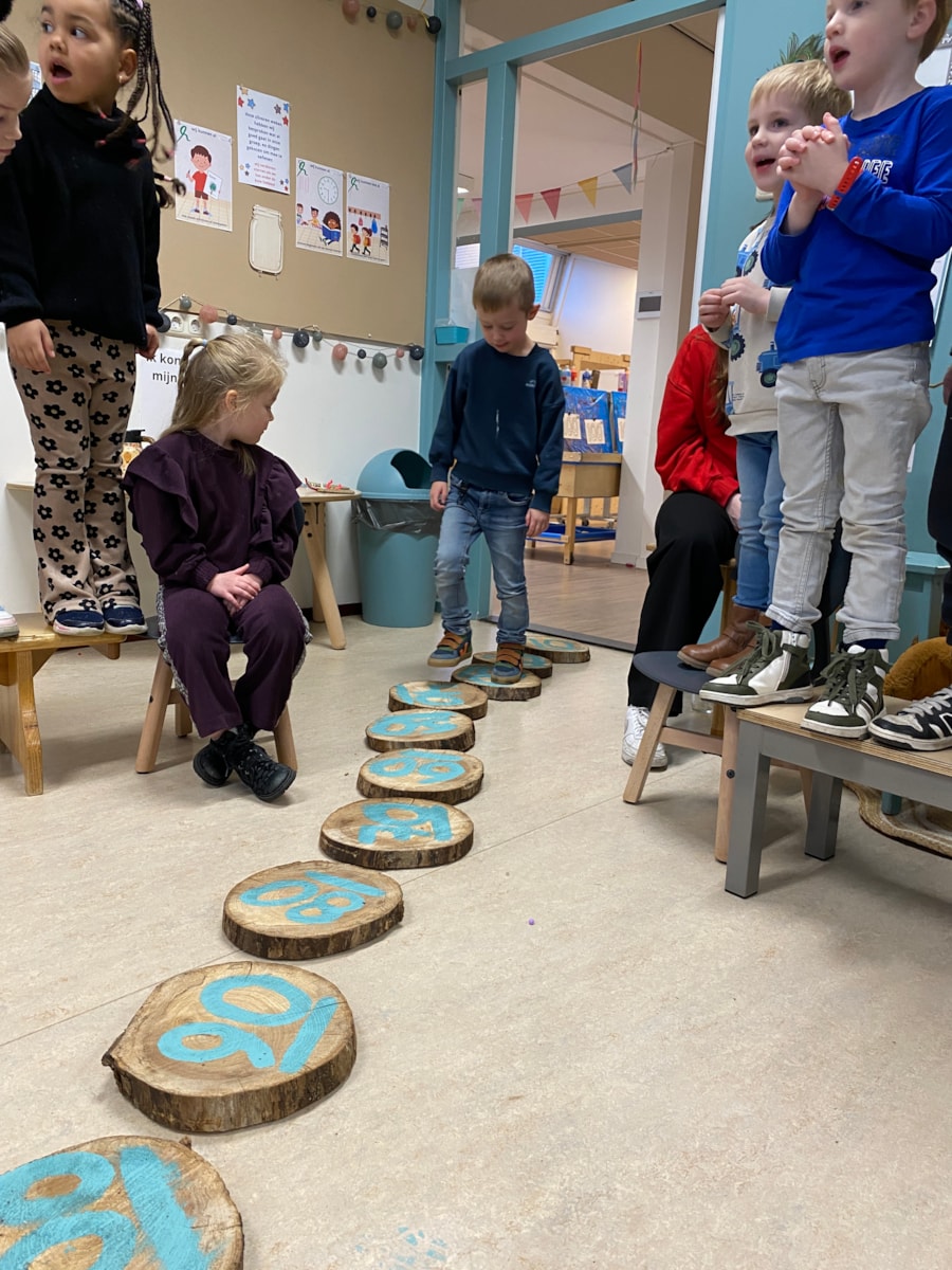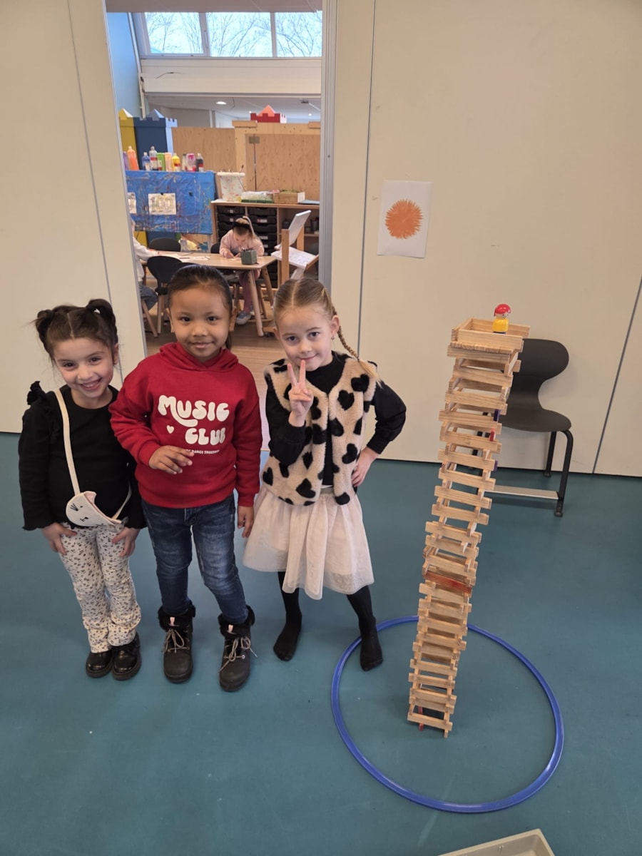 We waren vandaag al 100 dagen op school en dat hebben we flink gevierd met een ’100-dagen-feest’. We hebben 100 kaarsjes uitgeblazen, lekkere cakejes (versierd met een ’100’) gegeten, gebouwd en gespeeld met dingen waar we er 100 van hadden geteld, gegymd waarbij we bewegingen 100 seconden moesten volhouden, 100 ballonnen laten knallen, een slinger van 100 ringen gemaakt, gemeten met een meetlint van 100 centimeter. We hebben zelfs geschat waar we in 100 stappen naar toe zouden kunnen lopen en dit bleek bijna heel rondje door de school te zijn.