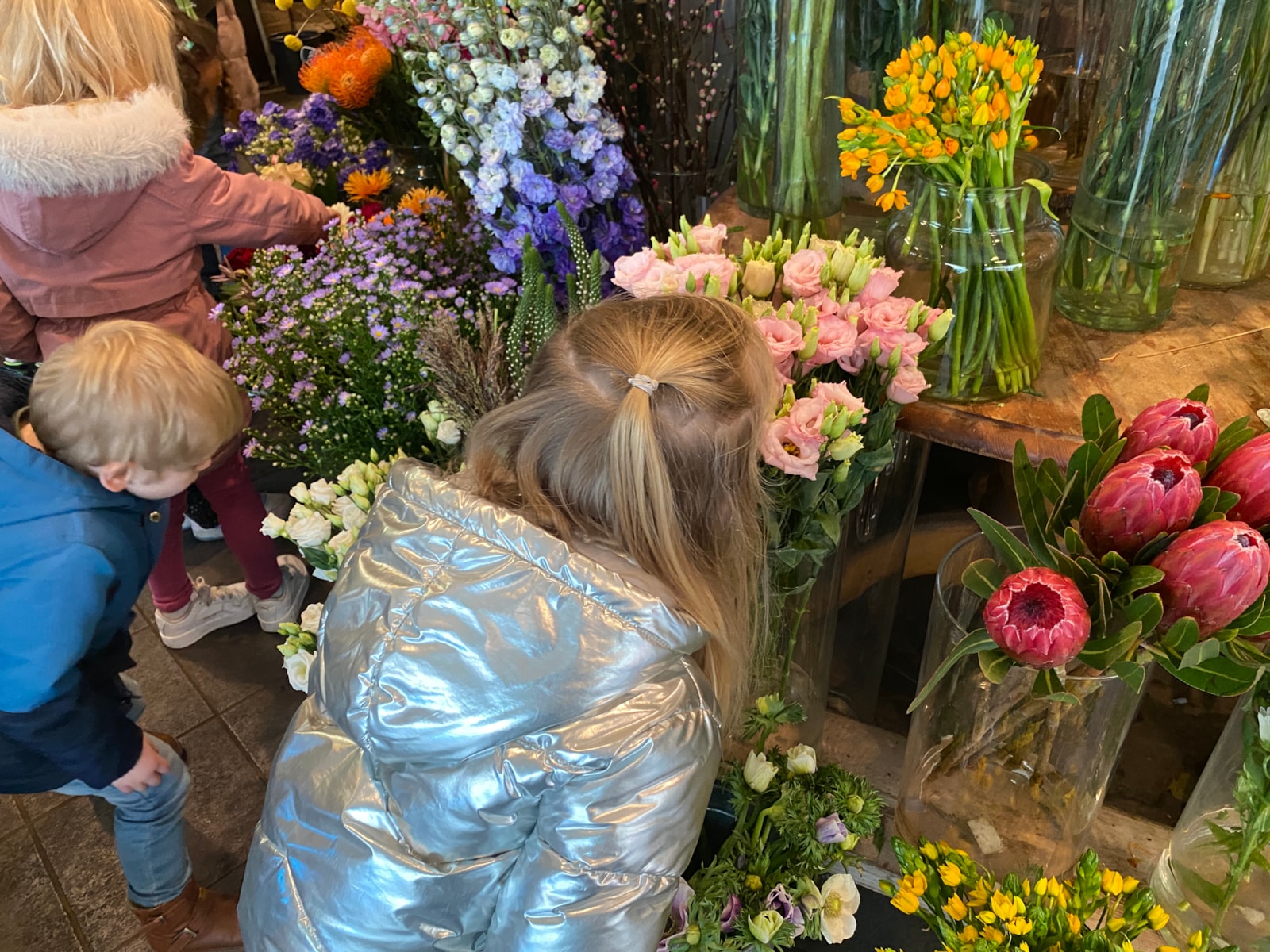 We hebben heel veel mooie bloemen gezien en geroken. Ook hebben we een bosje witte tulpen gekocht, maar achteraf wilde we toch graag een kleurtje. Ik heb de tulpen in de ecoline gezet, de kinderen waren het er niet mee eens, want dan zouden ze dood gaan. Ik was eigenwijs en heb het toch gedaan, als dat maar goed gaat...