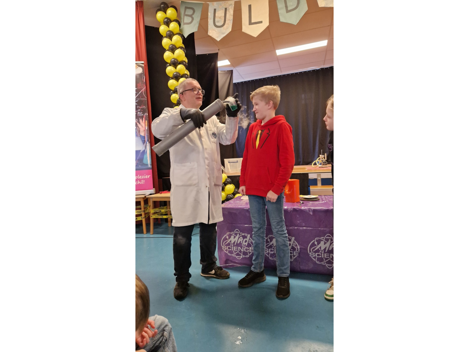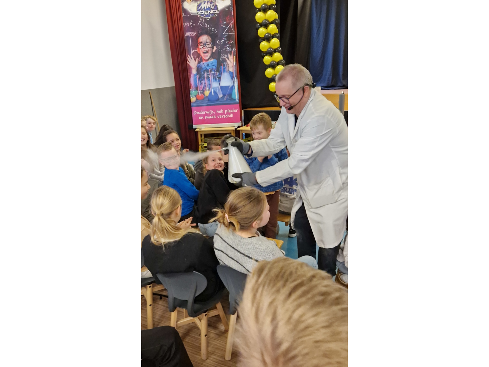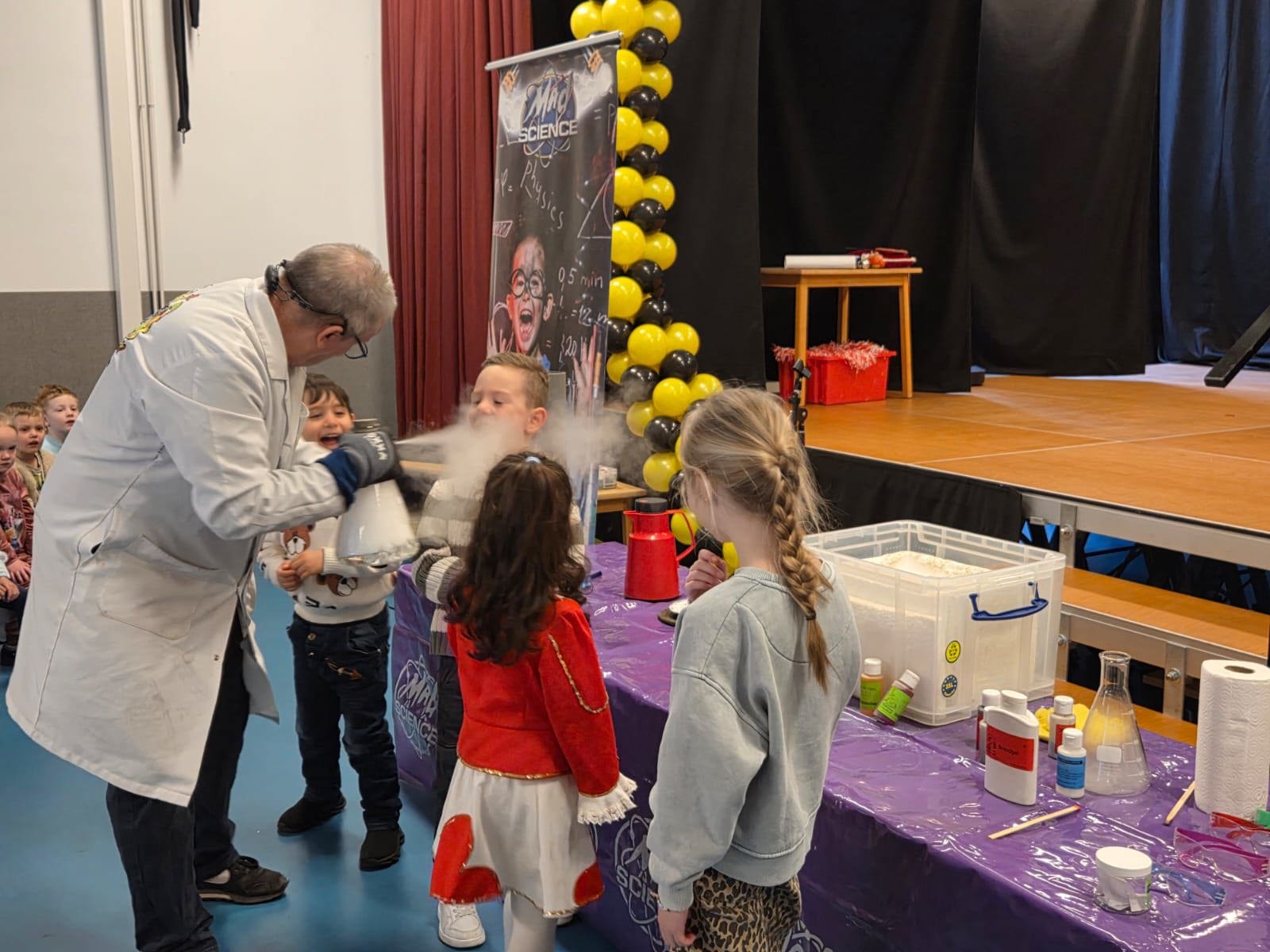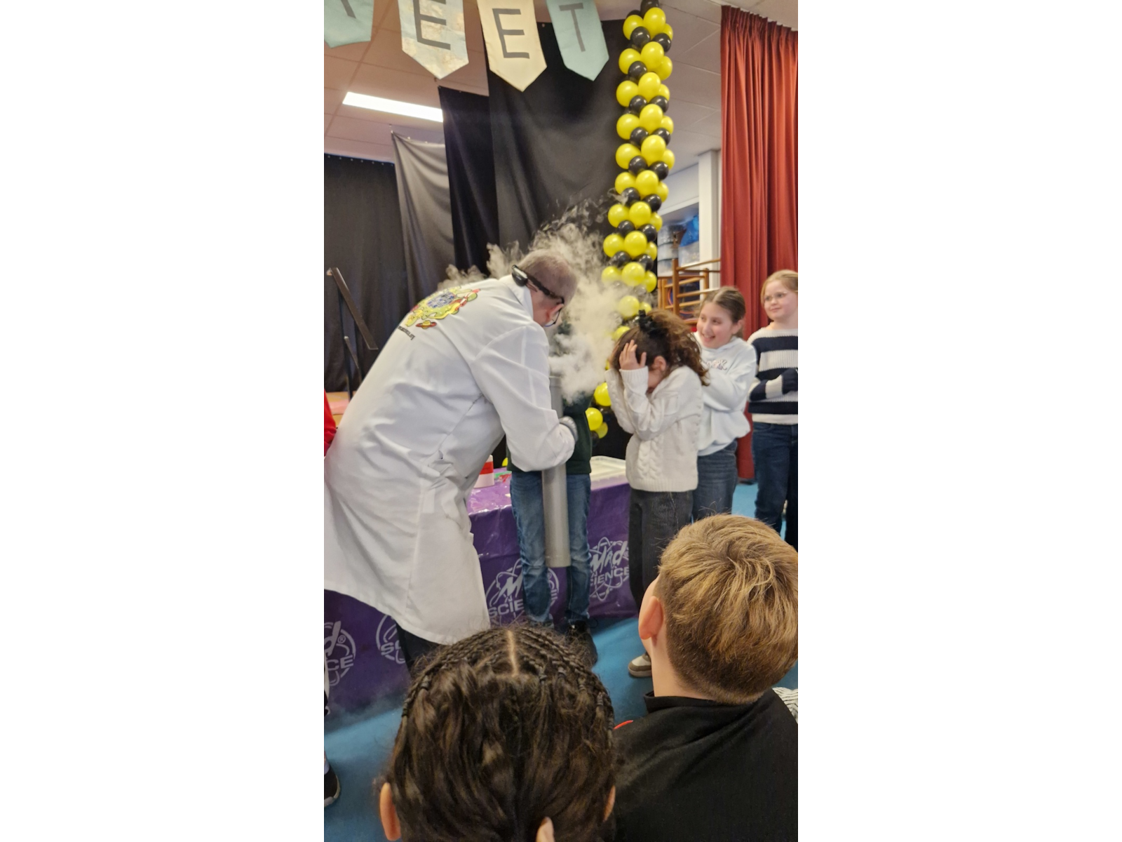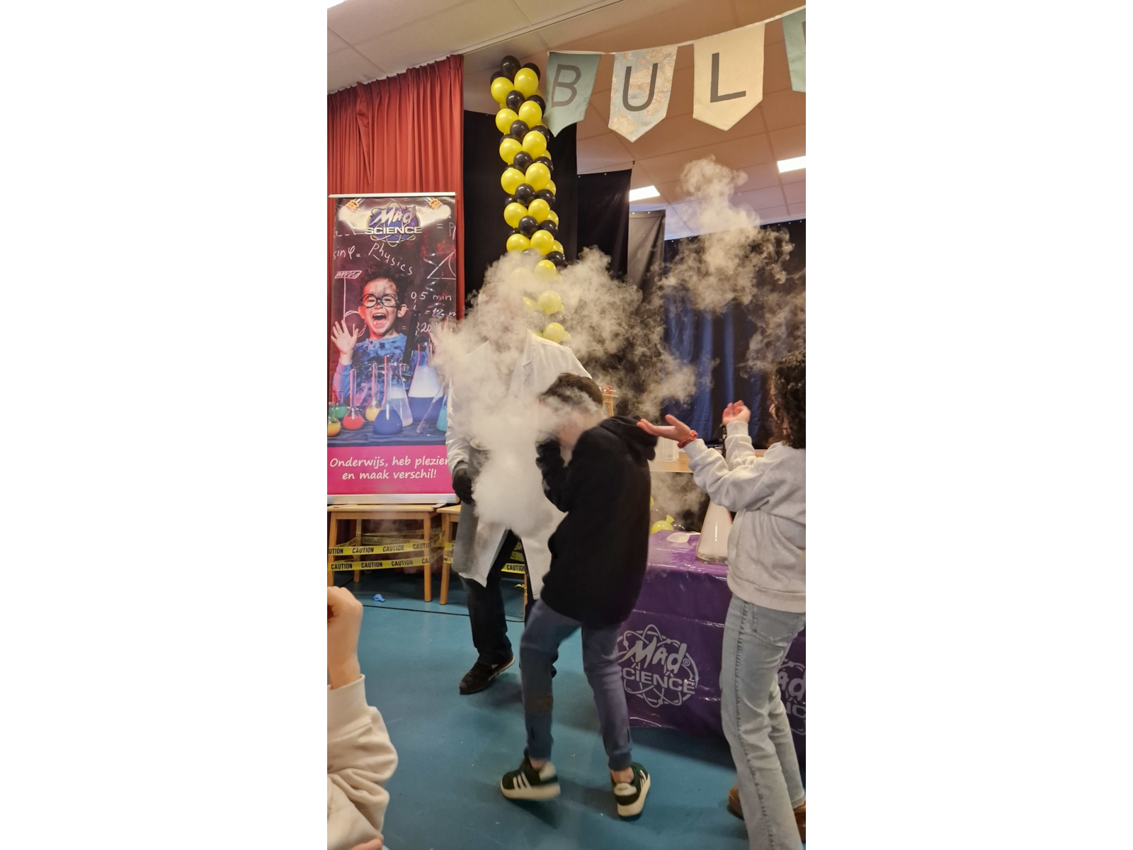 Vandaag hebben alle kinderen genoten van een show van een Mad Scientist! Vlammen, vuurwerk, droogijs, zeepbellen... van alles kwam voorbij.