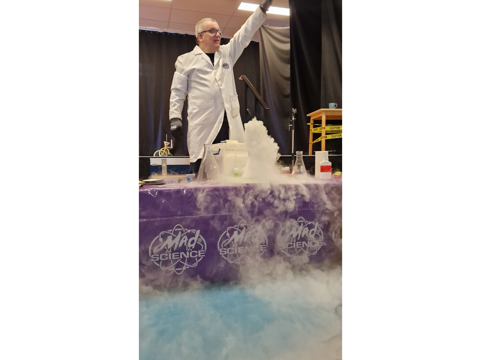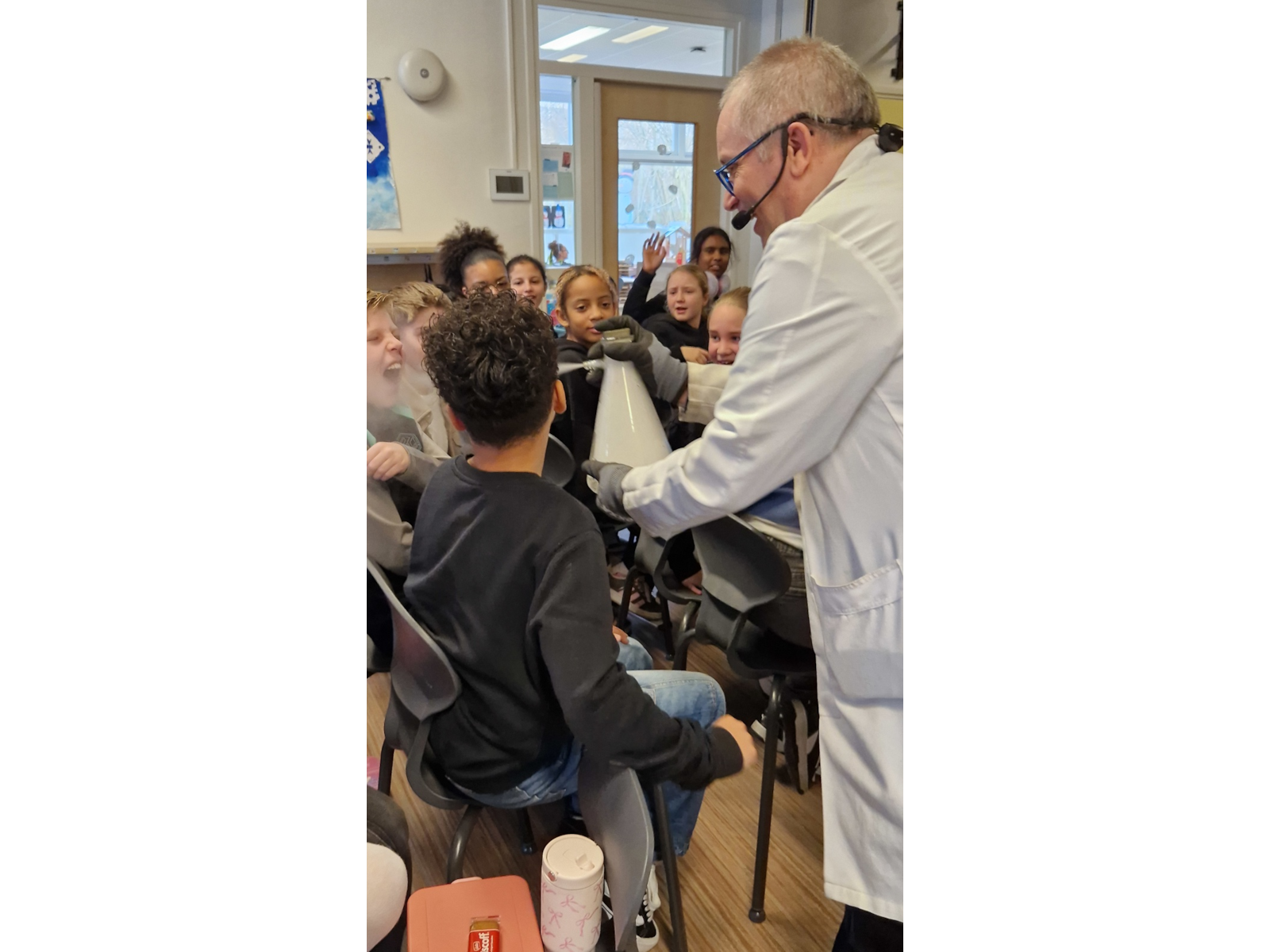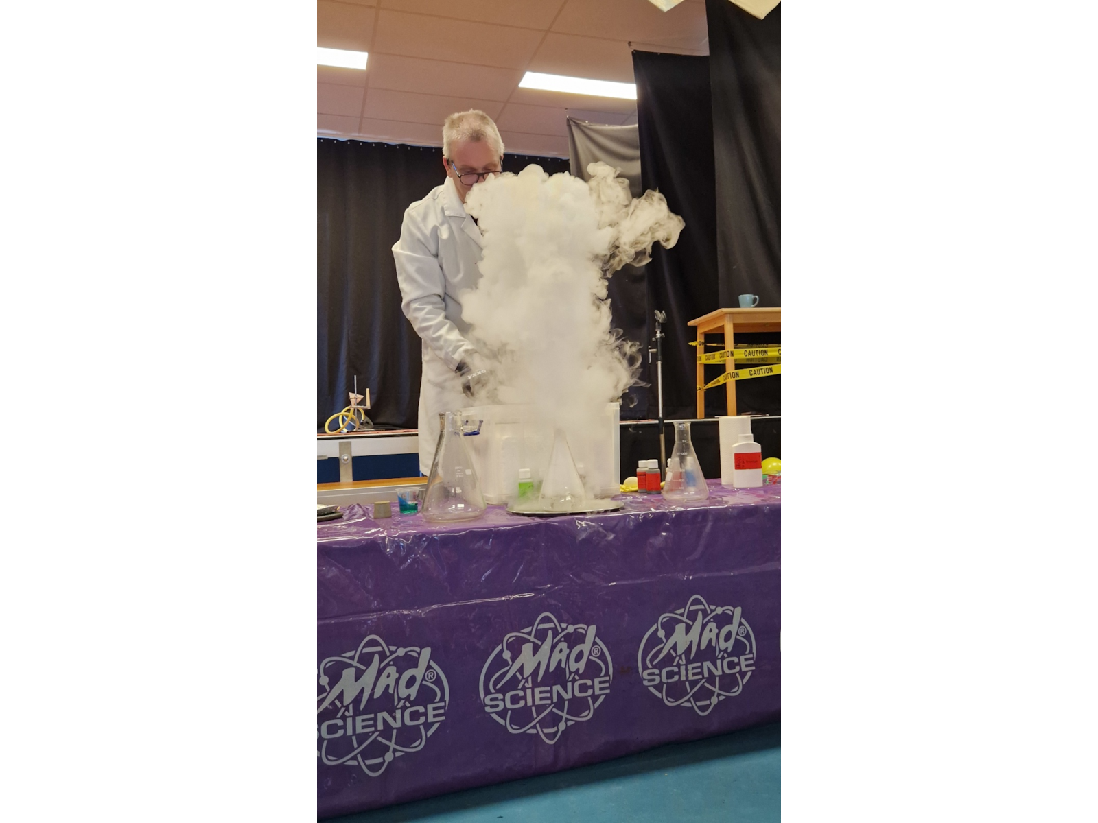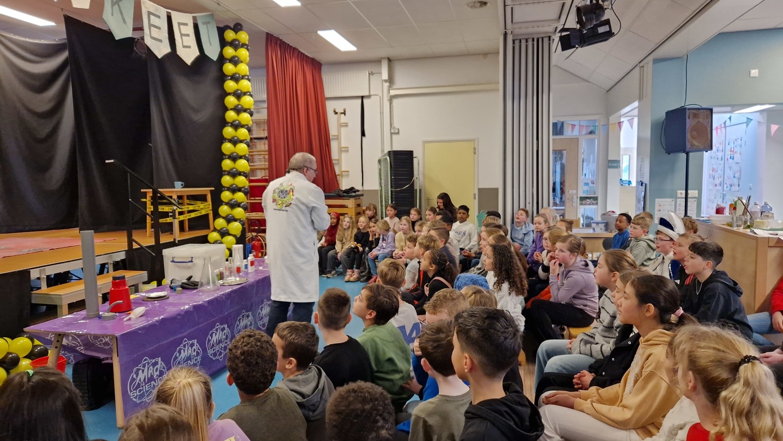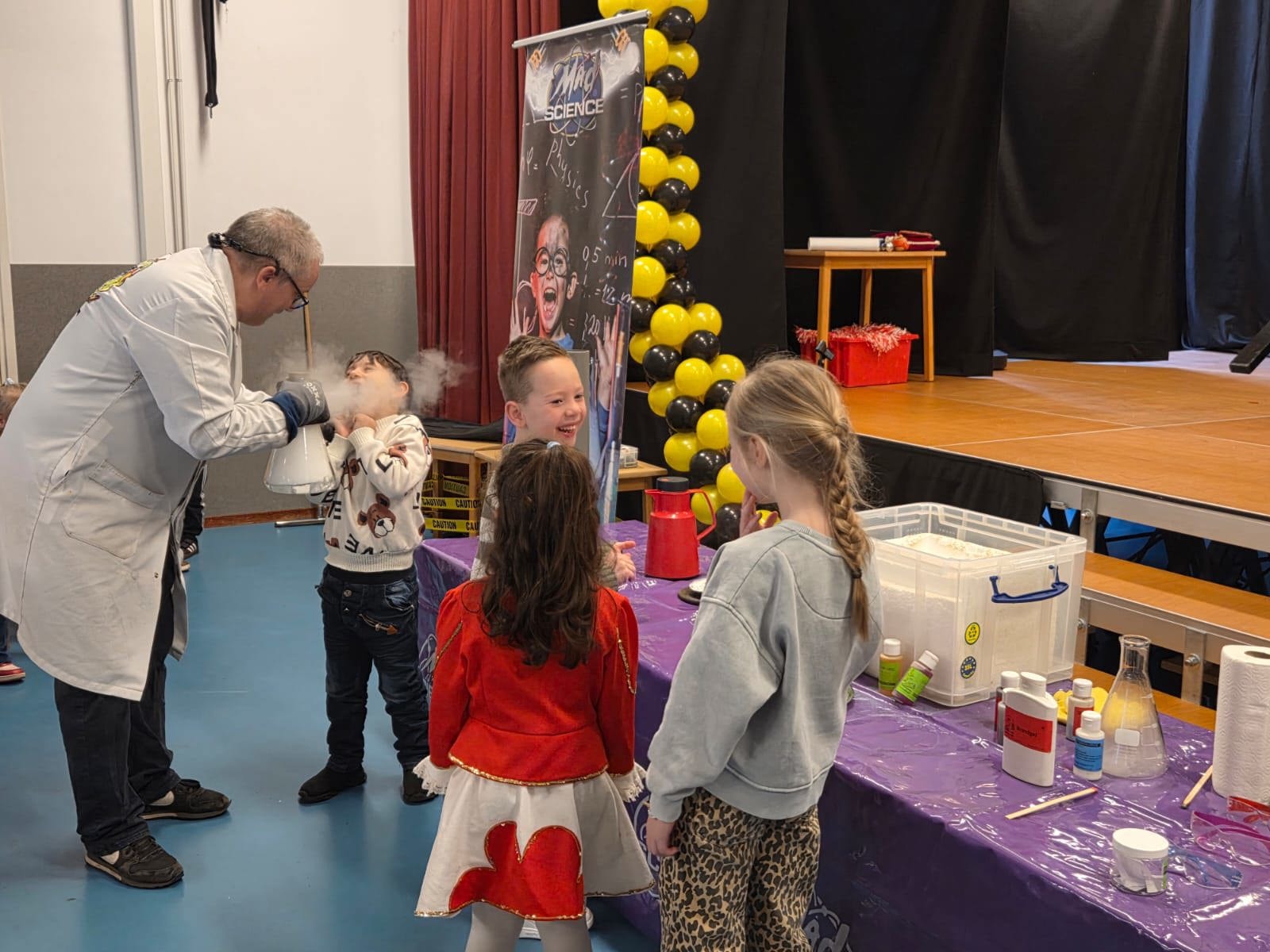 Vandaag hebben alle kinderen genoten van een show van een Mad Scientist! Vlammen, vuurwerk, droogijs, zeepbellen... van alles kwam voorbij.