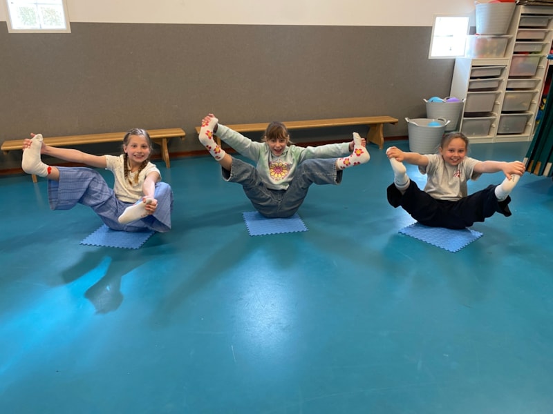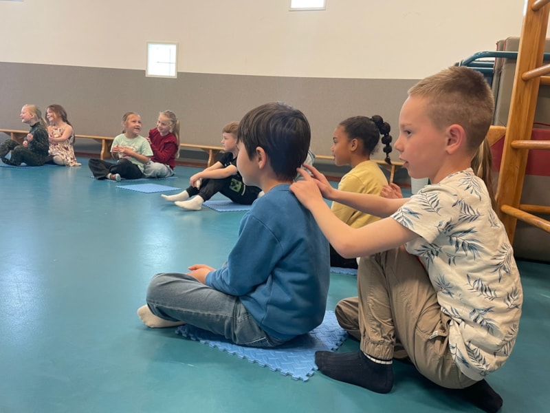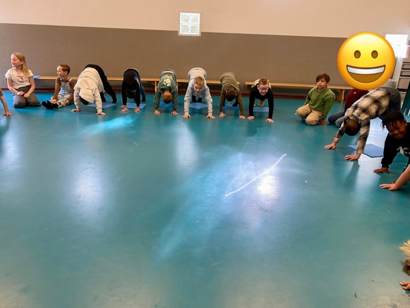In de klas hebben de kinderen het thema ‘Het pannenkoekenrestaurant’, dus een yogales mocht niet ontbreken.