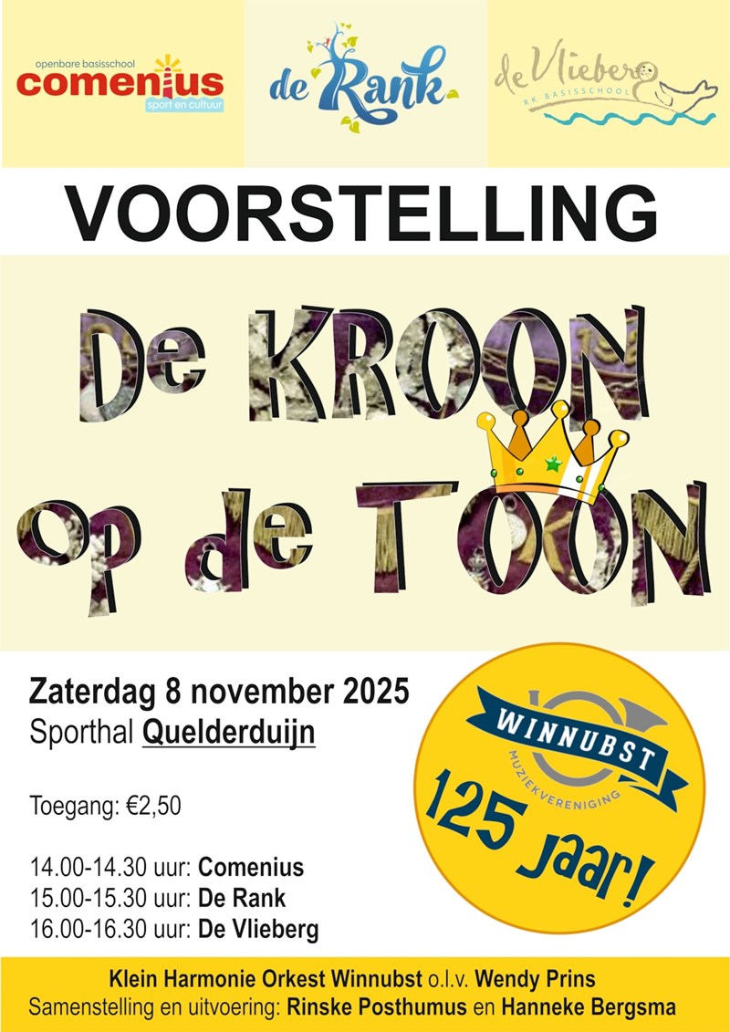 Vandaag kunt u op school kaartjes kopen voor ’De kroon op de toon’.